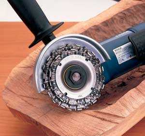 Основное назначение подобных насадок – снятие с древесины коры, обтесывание заготовки. Если «болгарка» в умелых руках, то с таким приспособлением можно сделать выборку материала. Например, при необходимости вырубки чаши. Если возводится бревенчатый сруб, то УШМ с такой насадкой отлично заменяет плотницкий топор.