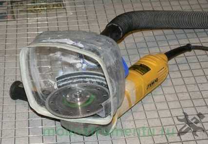 Штатный защитный кожух на болгарке не предусматривает подключения оборудования для удаления пыли при работе. Поэтому кожух с патрубком для пылесоса лучше изготовить самостоятельно (пылесос желательно строительный).