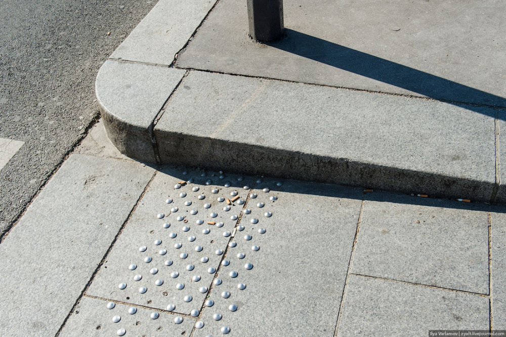 , чтобы исключить все препятствия на путях движения людей. Но было определено, что в российских условиях это создаёт трудности службам благоустройства – когда идет уборочная машина, весь мусор оказывается на тротуаре.Ограждение, бордюр с направляющей функцией вдоль тротуара