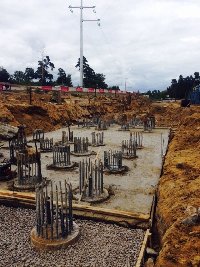 Строительный процесс включает бурение и полное удаление грунта с намеченной территории и заливку бетона в скважину.