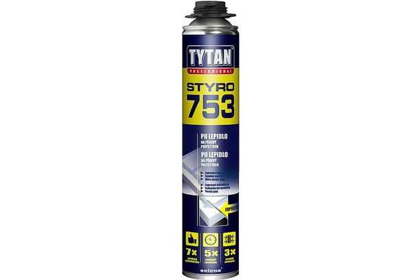 Также известен полиуретановый клей (пена) Tytan Styro. Он отлично склеивает поверхности между собой и является незаменимым герметиком. Нанесение этого состава осуществляется при помощи специально предназначенного для этих целей монтажного пистолета. В продаже также представлены упаковки в виде баллончиков с дозаторами или трубками.