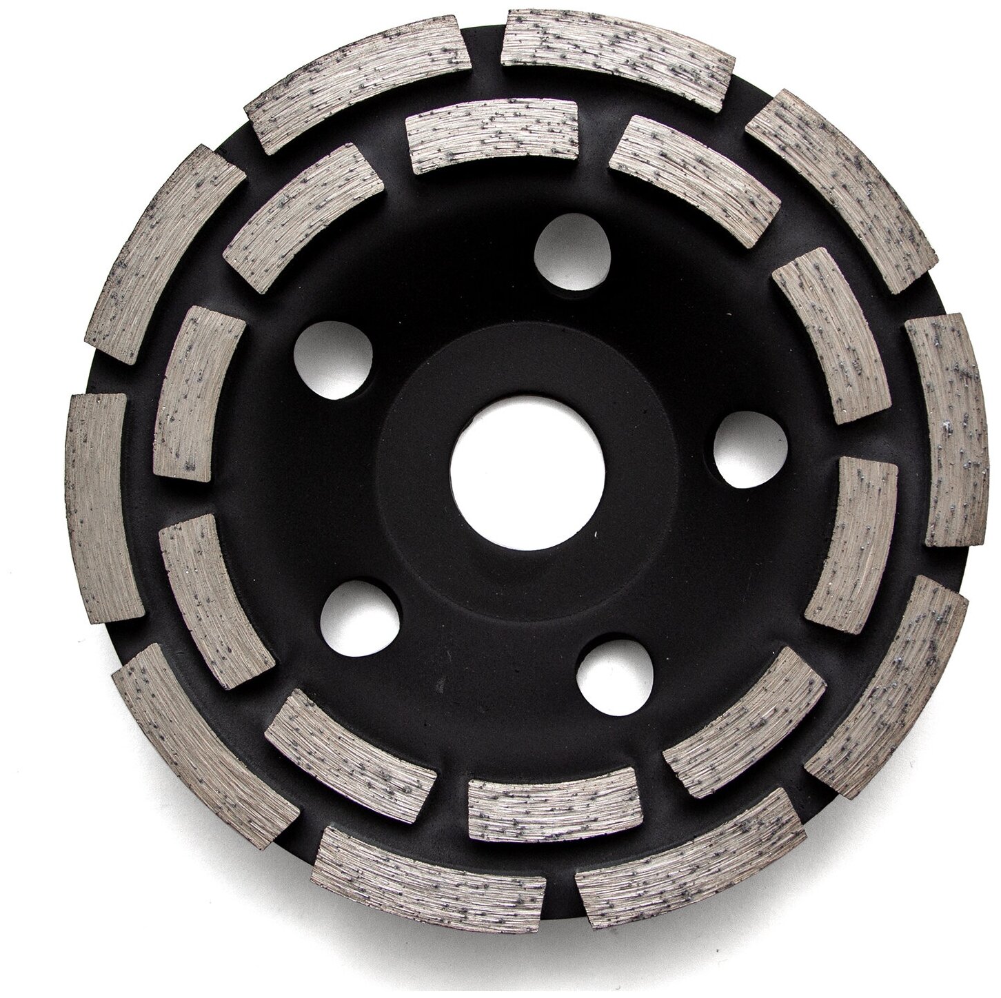 Состоит шлифкруг из металлического тела (диска), представляющего собой чашку, поэтому такую оснастку еще называют алмазной чашкой. Рабочей поверхностью является кромка диска, на которой расположены абразивные сегменты из алмазной крошки – они могут идти в ряд друг за другом или располагаться в хаотичном порядке. Высота сегментов достигает от 3 до 8 мм. Они фиксируются на поверхности оснастки очень прочно, так как нанесены методом пайки. Существуют однорядные и двухрядные шлифовальные круги. Последние имеют большую рабочую поверхность, поэтому воздействие на материал происходит наиболее интенсивно. В теле чашки проделываются отверстия для естественного охлаждения во время шлифовки.