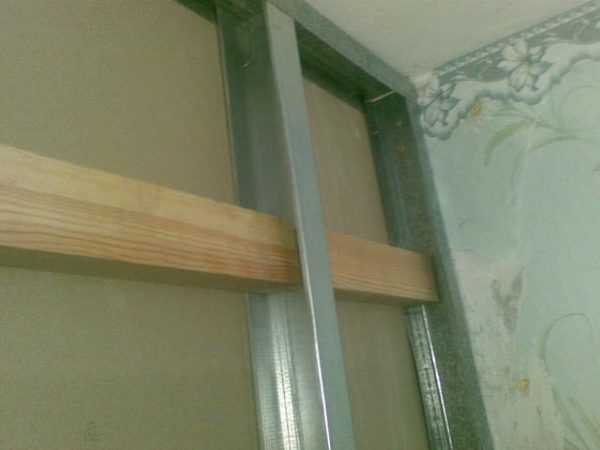 Если планируется установка дверей, то для этого в стоечный профиль закладываются брусья, обеспечивающие надёжную фиксацию короба.
