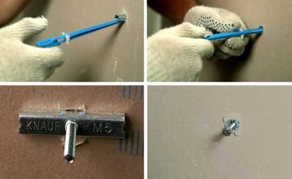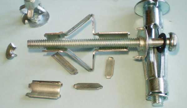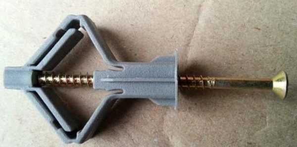 - Под дюбель — зонт или бабочку предварительно сверлятся отверстия, в которые вставляются метизы. При завинчивании шурупа под тыльной стороной ГКЛ раскроются упоры, зафиксировав крепёж. Подобной методикой можно навешивать предметы с нагрузкой до 10-15 кг на 1 точку.