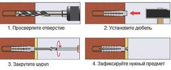 В зависимости от вида крепления, могут применяться различные технологии монтажа дюбелей и закрепления предмета.