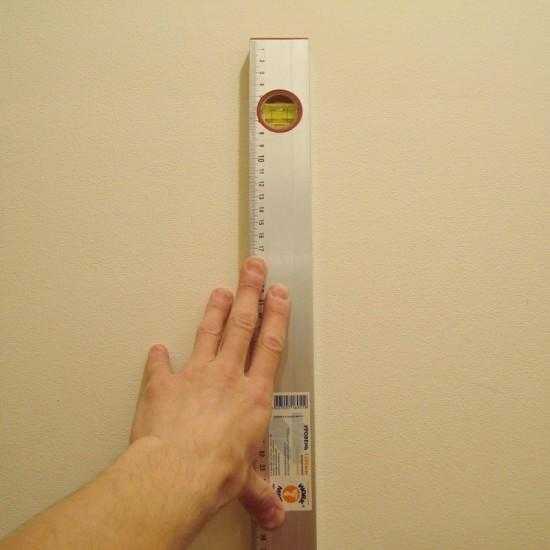 - Начальные рейки располагают горизонтально: нижнюю – над полом, верхнюю – под потолком. Их положение контролируют с помощью уровня. Затем монтируют вертикальные элементы обрешетки с шагом 50 см (применяется и горизонтальный монтаж с интервалом 60 см). Сверлят отверстия, вставляют дюбеля и вкручивают саморезы через 1 м друг от друга.