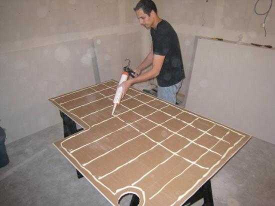 - Перед фиксацией листыустанавливают на подкладки толщиной 15 мм, которые после высыхания раствора вынимают. Образовавшиеся зазоры заполняют силиконовым герметиком.