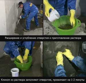 - Готовят раствор густой пастообразной консистенции, так, чтобы из него можно было слепить заглушку по форме отверстия в бетоне. Все работы необходимо проводить очень быстро: смешивание – не более 2 минут, заделка трещины или отверстия – 3 минуты.