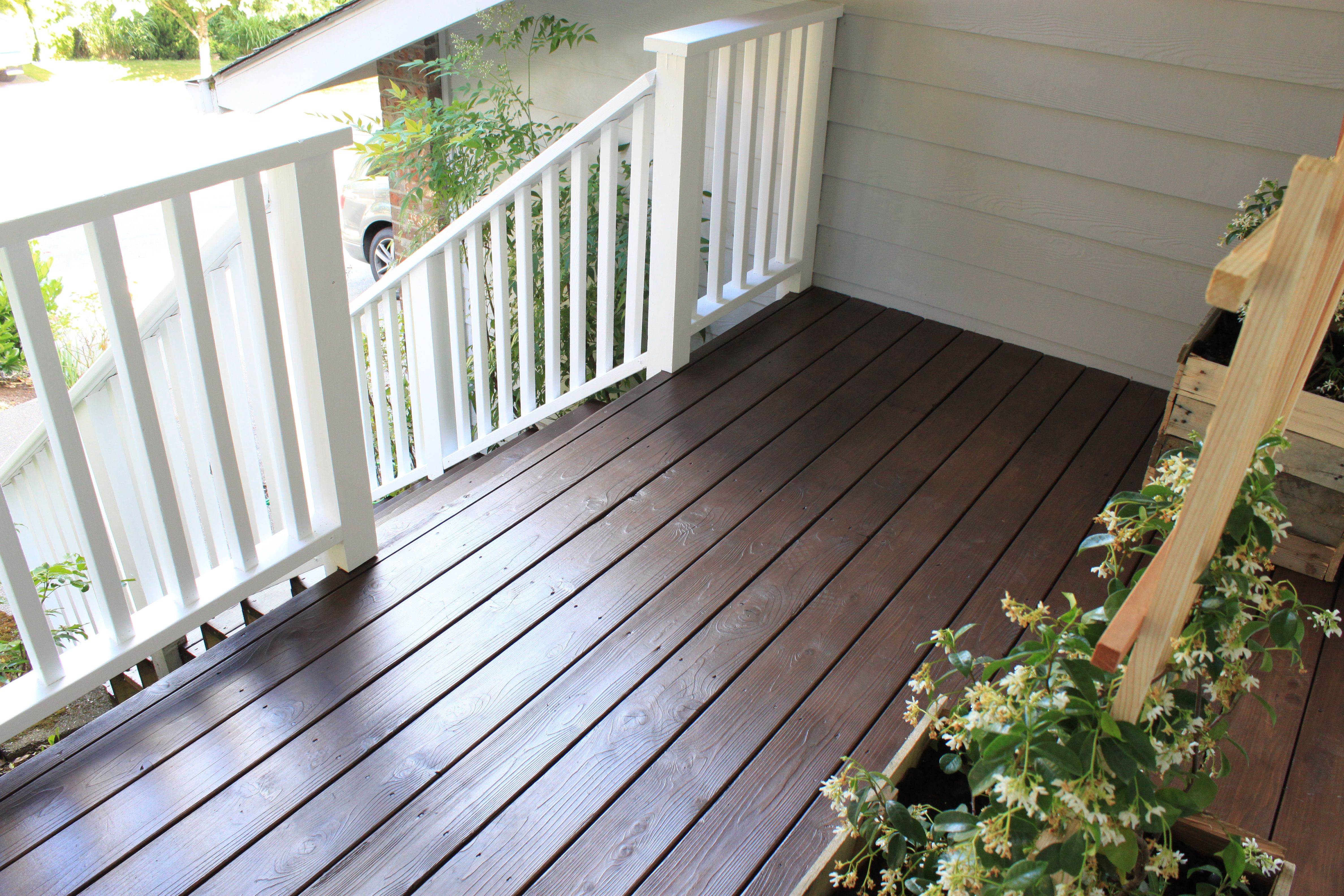 Наконец, я решил окрасить ступени крыльца, используя полупрозрачную атмосферостойкую универсальную морилку и герметик BEHR PREMIUM® серого цвета Cape Cod Grey.