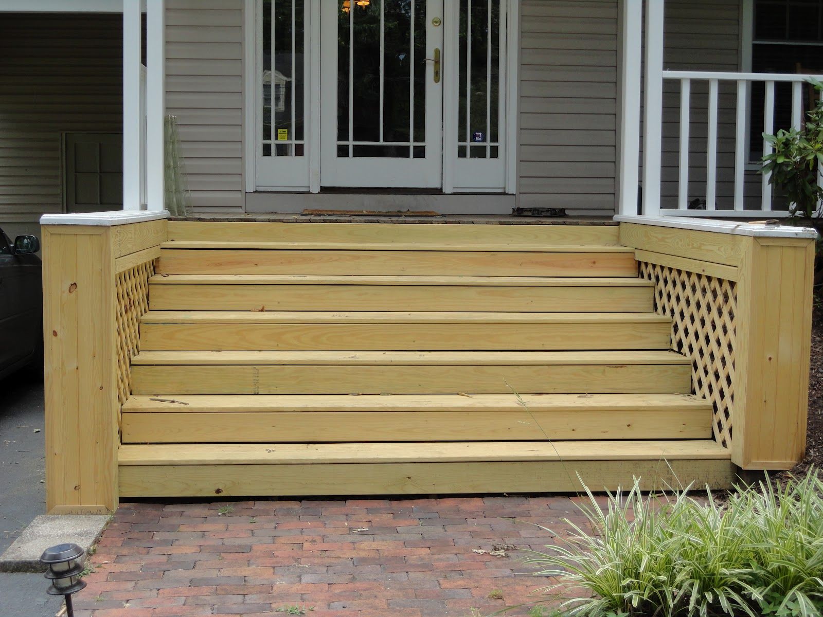 Ступеньки на крыльце были очень страшными. Несмотря на то, что они структурно прочны, они, очевидно, никогда не окрашивались и не герметизировались, а также были покрыты паутиной, обрезками сухой травы, опавшими листьями и пылью/грязью.Не судите!