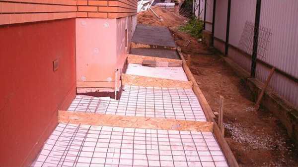 - Подготовленный участок заливают бетонным раствором, одновременно проводя армирование для большей прочности.