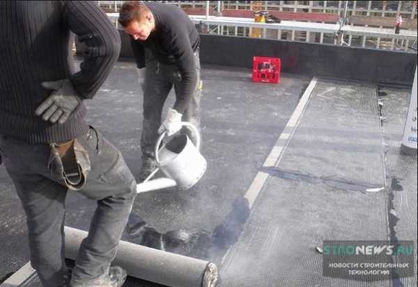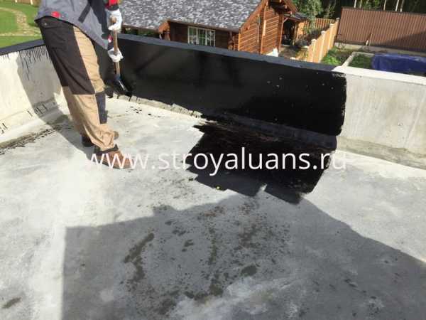 Одним из самых простых способов укладки гидроизоляционного ковра, является приклеивание рубероида на битумную мастику. Для этого понадобится грунтовка на основе битума или так называемый праймер. Который необходим, чтобы увеличить силу сцепления (адгезию) рулонного материала к поверхности из бетона или цементно-песчаного раствора. Посмотрите на фото как выглядит этот процесс.