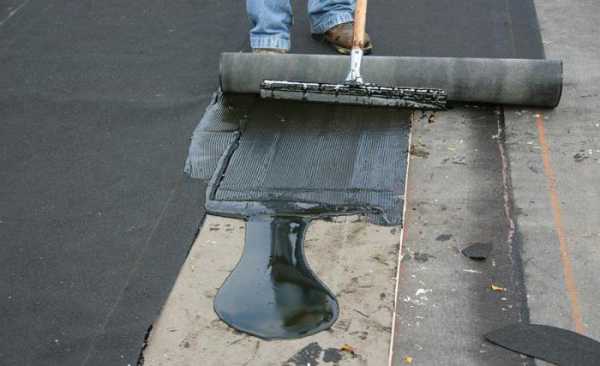 На подготовленную поверхность наносится клей для рубероида битумный, сверху выкладывают рубероид, разглаживая от центра к краям, чтобы не было пузырей. Если пузыри все-таки есть, нужно их проколоть, выпустить воздух и плотно прижать это место. После застывания – отпустить.