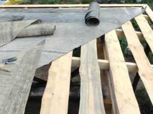 Чтобы сделать обрешетку скатной крыши, надо с чердака просовывать между ферм доску и, приложив с внешней стороны, прибить её к ферме. Начинают делать обрешетку снизу, когда обрешетка будет чуть больше ширины рулона, она промазывается мастикой и на неё ставится простилочный слой рубероида параллельно нижнему краю крыши. Крепится шиферными гвоздями. Потом делается следующий слой обрешетки, и т. д.