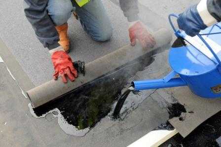 Битумная мастика наносится на подготовленную основание шпателями. Слой для склеивания рубероида не более 2 мм. После чего на обработанный участок раскатывается рулонная гидроизоляция. Перехлест полотен материала должен составлять не менее 80 миллиметров. Склеить рулоны, без образования пузырей и складок.