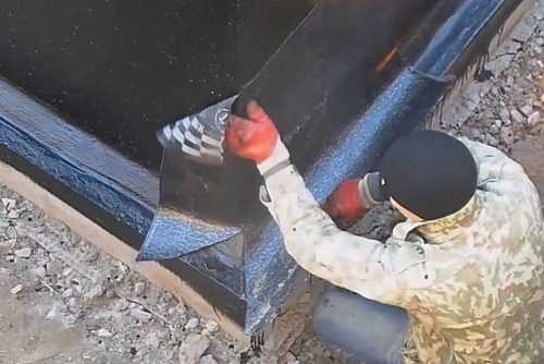 - при помощи горячего битума наклеить на фундаментную стену два слоя рулонного гидроизола, рубероида или другого подобного материала;