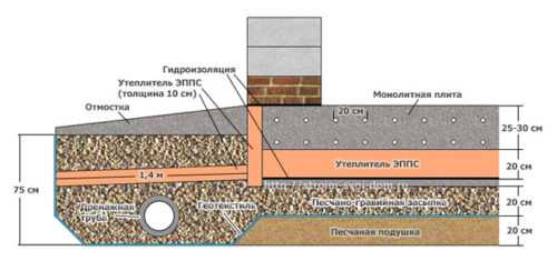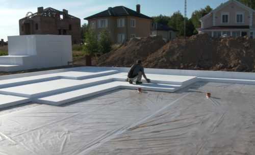 Также обязательно следует использовать пленку для дополнительной защиты и гидроизоляции утеплителя и фундамента.Количество слоев теплоизоляции определяется видом используемого материала, чаще всего это экструдированный пенополистирол, и климатическими особенностями региона, в котором ведется строительство.
