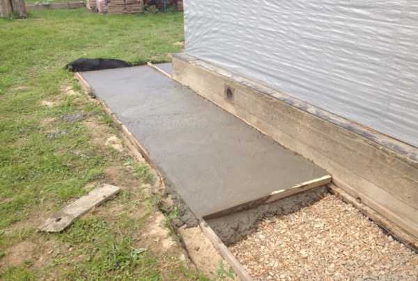 К любому фундаменту требуется сделать бетонную отмостку. Она бывает от 80 см до 2 м, все зависит от характеристик почвы. Если траншея засыпалась песчано-гравийной смесью, отмостку делают шириной 1 м.