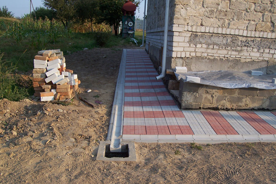 - Узкая отмостка, которая не совпадает с габаритами кровли и наклонным углом. Дорожку нужно планировать заблаговременно.