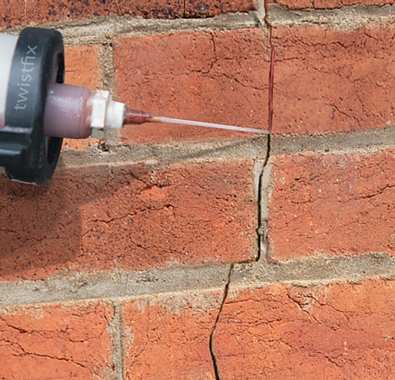 Заполнение трещин в кирпичной кладке производится не только с целью их ремонта, но и для образования перекрестного крепления – скважины просверливаются таким образом, чтобы после их заделки создалась усиливающая конструкция, которая предотвратит дальнейшее разрушение.