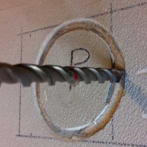 Подготовка к штроблению. После разметки, в размеченных центрах окружности необходимо сделать отверстие, буром незначительно большим диаметром, чем бур коронки (например буром 8-10мм). Высверливаем отверстие с запасом, учитывая длину сверла самой коронки (но не забываем про соседей и тонкие стены). Этот способ также подходит и при работе с алмазной коронкой на режиме сверления.