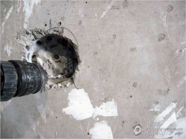 Что необходимо сделать, для установки подрозетника в бетон? Правильно! – Выдолбить под подрозетник лунку! Для этого лучше всего использовать дрель с алмазной коронкой, но это не самый лучший вариант в плане дешевизны. Более удобный и практичный вариант, — это перфоратор с ударной коронкой по бетону, ну или просто вырезать бетон болгаркой с диском по камню (но это очень грязный способ, и пыль будет абсолютно везде: в ушах, глазах и в подъезде).