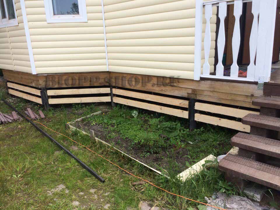 Если учесть, что на винтовых сваях строят не только жилые дома, но и различные хозпостройки: бани, сараи, времянки, то закрыть пространство под ними можно самым простым и дешёвым способом.