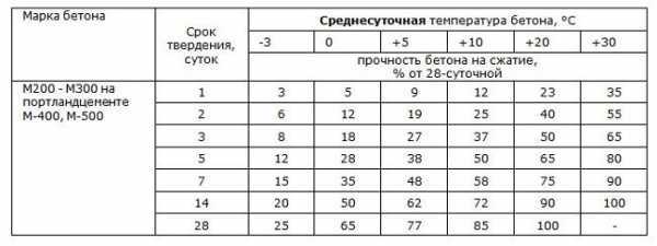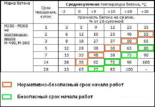 Для стройматериала М200-М300, изготовленного на основе портландцемента М400 или М500, в результате исследований инженерами разработана специальная таблица, по которой рассчитывают, через сколько дней можно снять опалубку.