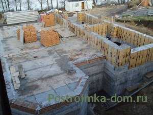 1. Строительство начинается с организации котлована заданной глубины (1,6-2,5 м) большего на 1 м размеров будущего дома. Затем производится засыпка с трамбованием щебнем и песком (организация подсыпной подушки), следом выполняется армированная заливка бетоном площадки. И только после затвердения бетона можно возводить стены из любого штучного материала: кирпич, блоки, плиты.