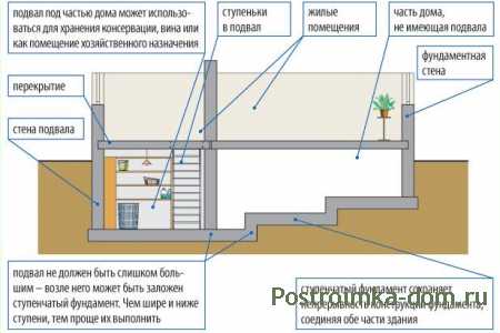 Стоит отдельно отметить, что очень часто выполняется подвал не под всем домом, а только его частью, что позволяет сэкономить средства. В таких случаях пользуются технологией отливки фундамента в грунт, причем траншея выкапывается неравномерно, а на требуемую глубину с переходом на заглубление цоколя.