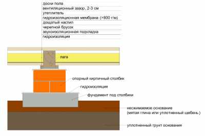 Но есть и другая технология – кирпичные опоры. Цементный раствор заливают в специально подготовленные опалубки отдельно для каждой опоры или для ряда опор, предназначенных для одной лаги. На полученные основания стелют слой гидроизоляции и устанавливают опоры из красного кирпича. Поверх опор прокладывают еще один гидроизолирующий слой и звукоизоляционный материал. Фиксируют лаги. Монтируют черепные бруски по бокам лаг, на черепные бруски производится черновой настил древесины. Сверху на доски (в промежутках между лагами) прокладывается очередная гидроизолирующая прослойка, а затем монтируется утеплитель. Про утепление пола в деревянном доме читайте тут.