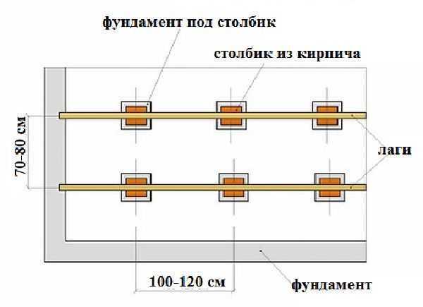 Столбики для пола делают из кирпича, небольших бетонных блоков или используют готовые бетонные блоки типа «ФЛ». Можно в качестве столбиков использовать пропитанные битумом деревянные чурбаки. Некоторые ставят на основание валуны подходящего размера с плоской верхушкой. Валуны — хорошая опора, но крепить к ним лаги проблематично.
