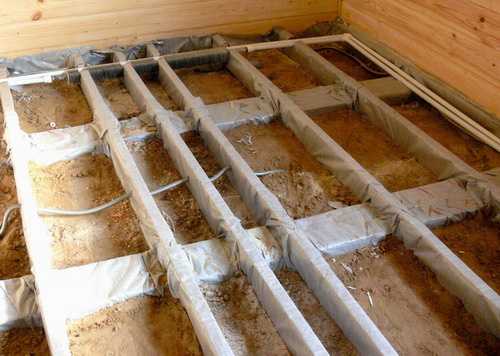 Когда каркас установлен, можно приступать к утеплению пола. Интервал между лагами заполняется ватой или керамзитом. Толщина ваты при этом должна составлять 5 см. Дальше нужно настелить пароизоляцию. Материал крепится верху утеплителя при помощи степлера.