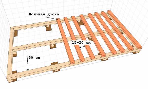 Иногда для удобства между лагами устанавливают дополнительные перемычки. Такой каркас для настилки половиц требует больше материалов, но позволяет сэкономить на половой доске: ее можно брать меньшей толщины, так как опоры расположены чаще.