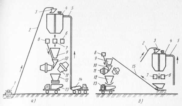 Рис. 1. Схемы компоновки бетоносмесительных установок: а — башенная (вертикальная), б — двухступенчатая (партерная): 1 — конвейер склада заполнителей, 2 — конвейер подачи заполнителей в расходные бункера, 3, 9, 10 — поворотная направляющая, распределительная воронка, 4 — расходный бункер, 5 — труба пнев-моподачи цемента, 6…8— дозаторы цемента, заполнителей, воды, 11 — бетоносмеситель, 12 — раздаточный бункер, 13 — автобетоновоз, 14 — автоцементовоз, 15 — скиповый