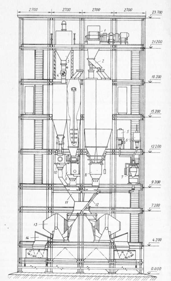 Рис. 25. Бетоносмесительный цех: 1 — конвейер, 2 — воронка поворотная, 3 — циклон, 4 — шнек, 5 — бак для дооавок, 6 —бак для воды, 7 — дозатор жидкости, S — дозатор крупного заполнителя, 9 дозатор мелкого заполнителя. 10 – дозатор цемента 11 — сборная воронка, 12 – трубопровод, 13 – гравитационный бетоносмеситель, 14—расходный бункер