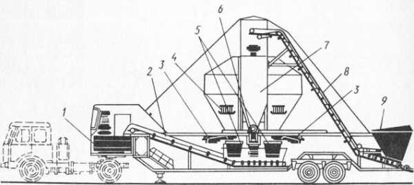 Рис. 4. Схема мобильной автоматизированной бетоносмесительной установки СБ-61: 1 —смеситель, 2, 8— ленточный конвейер, 3 — ленточный питатель, 4 — отопительный регистр, 5 – дозатор заполнителей, 6 — дозатор вяжущих, 7 — бункер вяжущих, 9 — приемный бункеп заполнителей