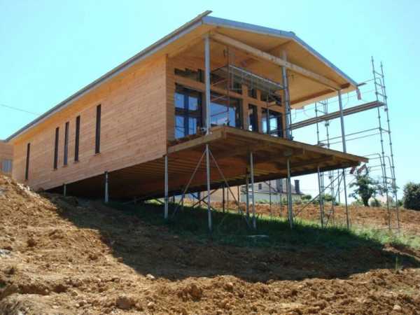 В большинстве случаев сваи выходят на поверхность земли на значительную высоту – до полуметра, особенно на поверхностях грунта, находящихся под уклоном. Таким образом, основание дома поднято над землей.