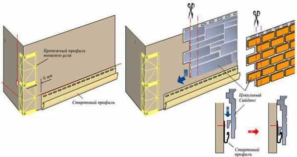 Монтаж сайдинга к обрешетке начинается с нижней панели. Крепление производится к деревянной обрешетке с помощью саморезов. Углы устраиваются на специальные профили. Верхняя панель может быть подрезана по высоте цоколя. Над верхней панелью монтируют олив – чтобы при дожде вода отродилась от цоколя.