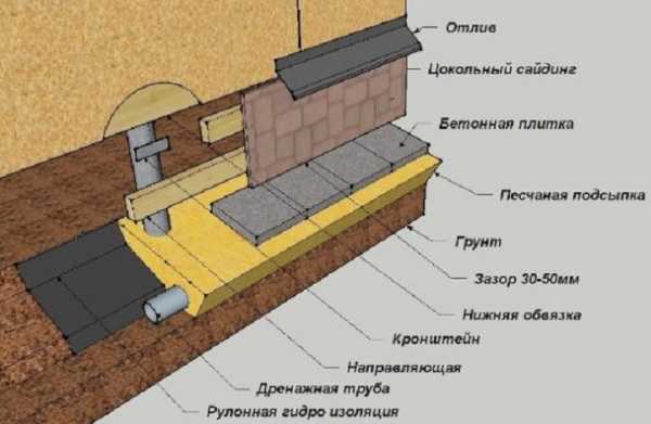Схема крепления сайдинга к обрешеткеПространство под нижней панелью, о котором мы упоминали, закрывается отмосткой – чтобы исключить проникновение ветряных потоков, мусора, мелкой живности, насекомых.