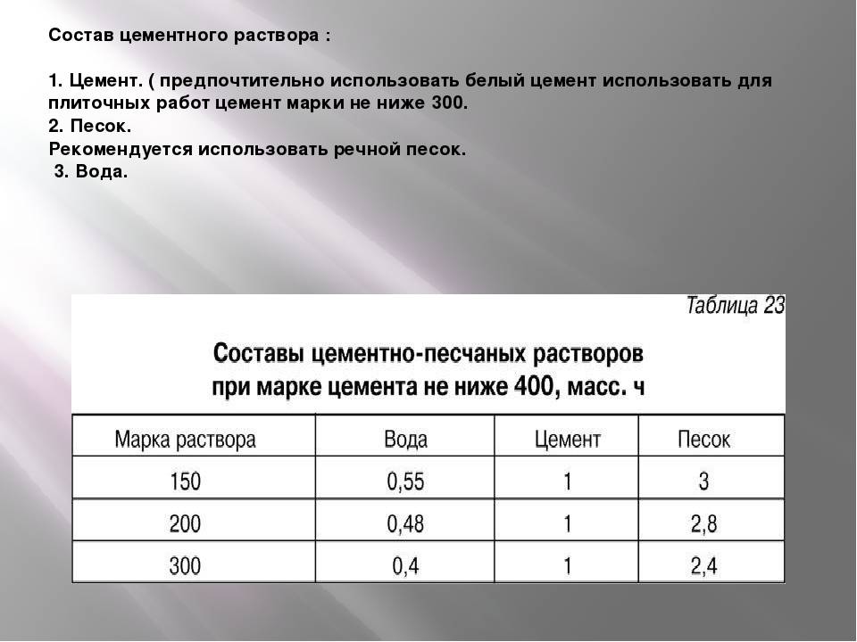 В зависимости от того, из какой марки приготовлена цементно-песчаная смесь, расход на 1 м2 (пропорции) будет различным. Ведь необходимо разное количество воды для замешивания раствора в каждом конкретном случае.