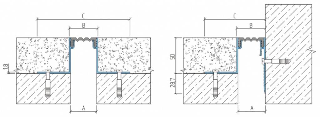 Их работа аналогична усадочным швам, однако они способствуют только горизонтальным подвижкам. Устанавливаются так: выполняется установка реек посреди глубины стяжки под углами по шву. Эти реи нельзя комбинировать со шпилечными.