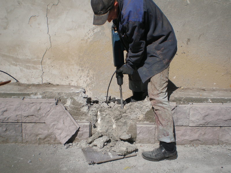 - Бетонная плита. Сначала выполняется демонтаж цементной стяжки, после чего нарезается штроба протяженностью 30 см, а отдельные куски цемента отбиваются посредством отбойника. Далее определяется расположение в плите прутьев арматуры, их направление. Плиту вдоль стержней разрушают полосами, ширина которых составляет до 40 см. Для демонтажа бетонных элементов чаще всего используется отбойный молоток, а для нарезки арматурных прутьев газовый резак. Завершающим шагом при выполнении работ будет демонтаж несущих балок, сначала вспомогательных, потом основных: на первом этапе фиксируются опоры, а далее плиты разбиваются отбойником, каркас из арматуры разрезается.