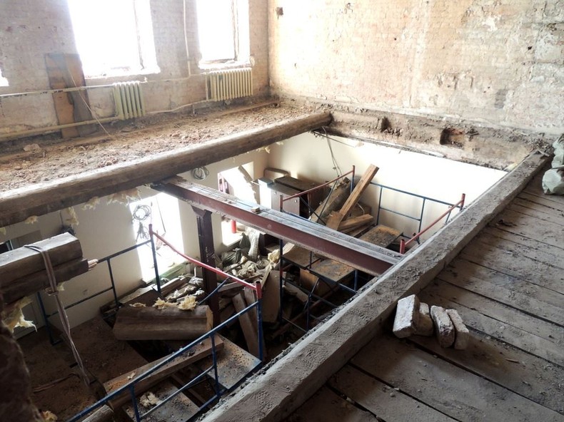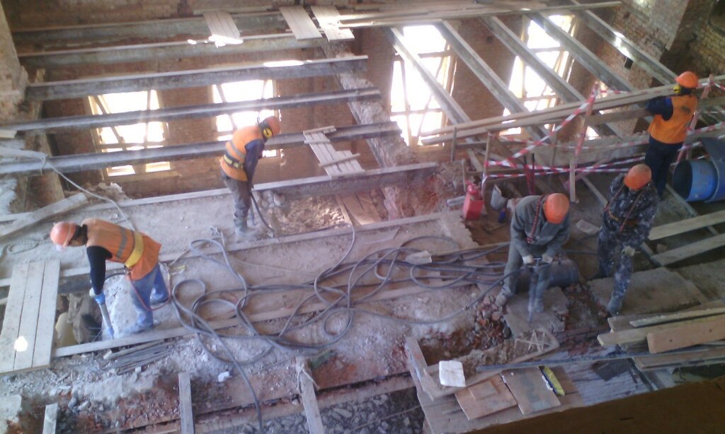Первоначально осуществляется фрезеровка бетонного пола, снимаются все напольные покрытия, затем ставятся подпоры. Только после этого можно начинать разборку перекрытия. Здесь не стоит прибегать к ударным демонтирующим приборам, так как их работа может разрушить другие части постройки, которые нужно сохранить целыми. В работе могут понадобиться стойки-домкраты.