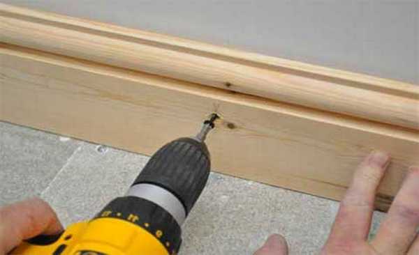 Как и в случае с ПВХ, плинтуса из дерева сверлят перфоратором прямо насквозь, затем ставят дюбель и закручивают саморез. Причем дюбель надо затолкнуть в отверстие не только плинтуса, но и пола или стены, что иногда бывает нелегко.