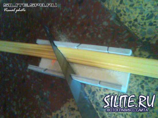 В станине стусла предусмотрены отверстия, через которые оно легко крепится к основе – столу или табурету. Надёжно зафиксированный инструмент не будет скользить, и ваша работа гарантированно получится аккуратной. Плинтусная планка помещается в станину и зажимами крепится к одной из стенок, если в конструкции стусла зажимов нет, материал крепко удерживается руками. В направляющие щели на каждой из сторон стусла установите режущий инструмент и начинайте распил. Можно взять обыкновенную ножовку для дерева, но лучше под рукой иметь обушковую пилу, она оставляет более аккуратный рез, и край плинтуса будет ровным, без защипов.