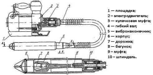 - электромеханические устройства, функционирующее от двигателя с питающим напряжением 220 или 380 В и частотой 50 Гц. Крутящий момент через гибкий вал длиной 1,5–6 м преобразуется в вибрацию рабочего органа;