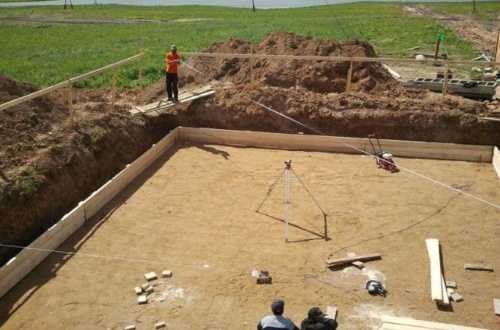 - Пользуясь оптическим нивелиром можно помочь тому же трактору сделать котлован почти ровным, таким, чтобы лопатой можно было сделать практически горизонтальную плоскость. И прямо на этом родном нетронутом грунте заливаем фундамент.
