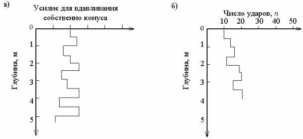 В результате динамического зондирования строятся графики зависимости количества ударов для погружения стандартного конуса (на 10 см) или пробоотборника в зависимости от залегания тех или иных пластов грунта (рис.М.3.21).