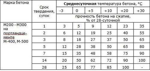 В следующей таблице можно увидеть показатель прочности бетона в зависимости от температуры, при которой производились работы.